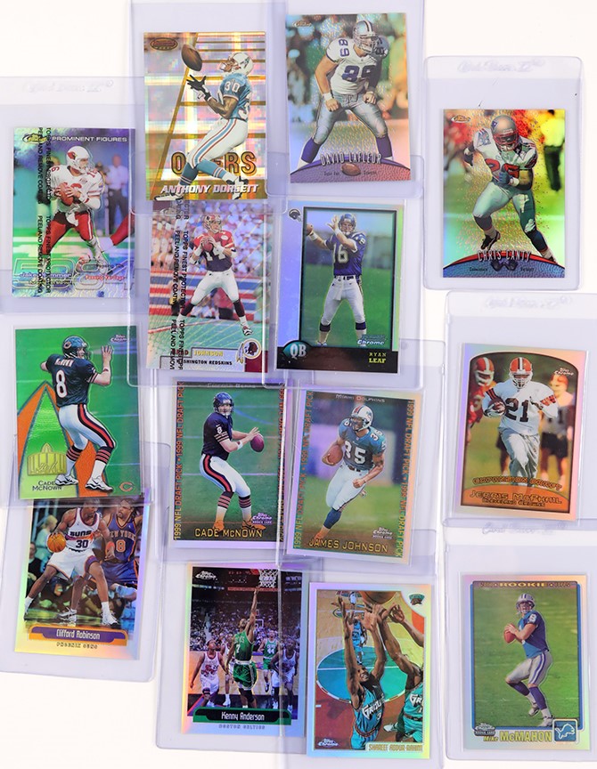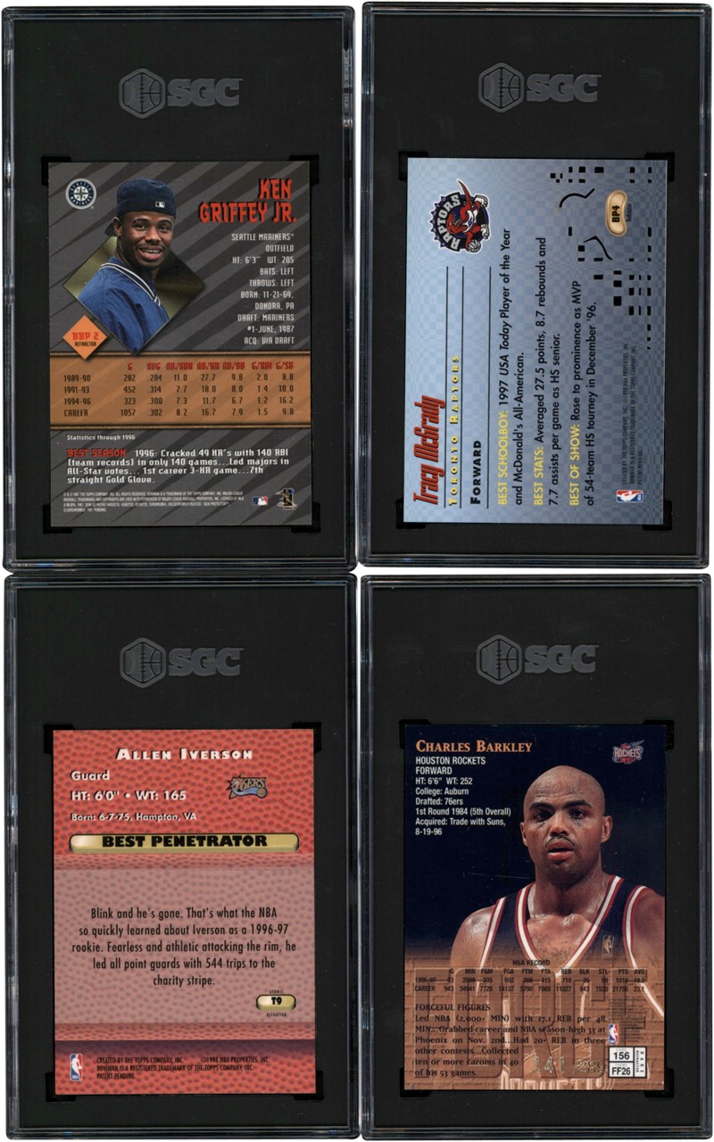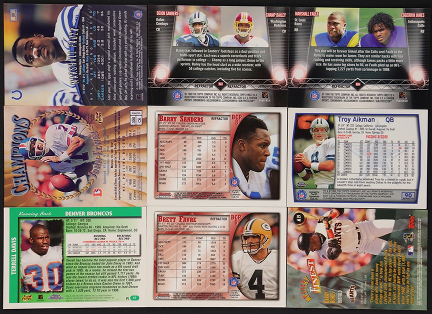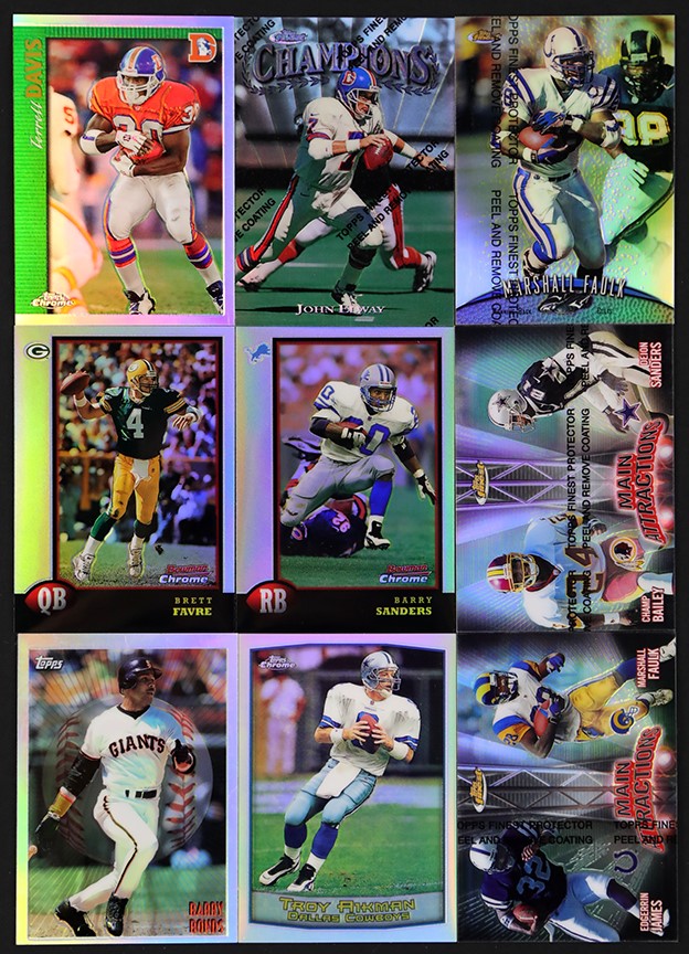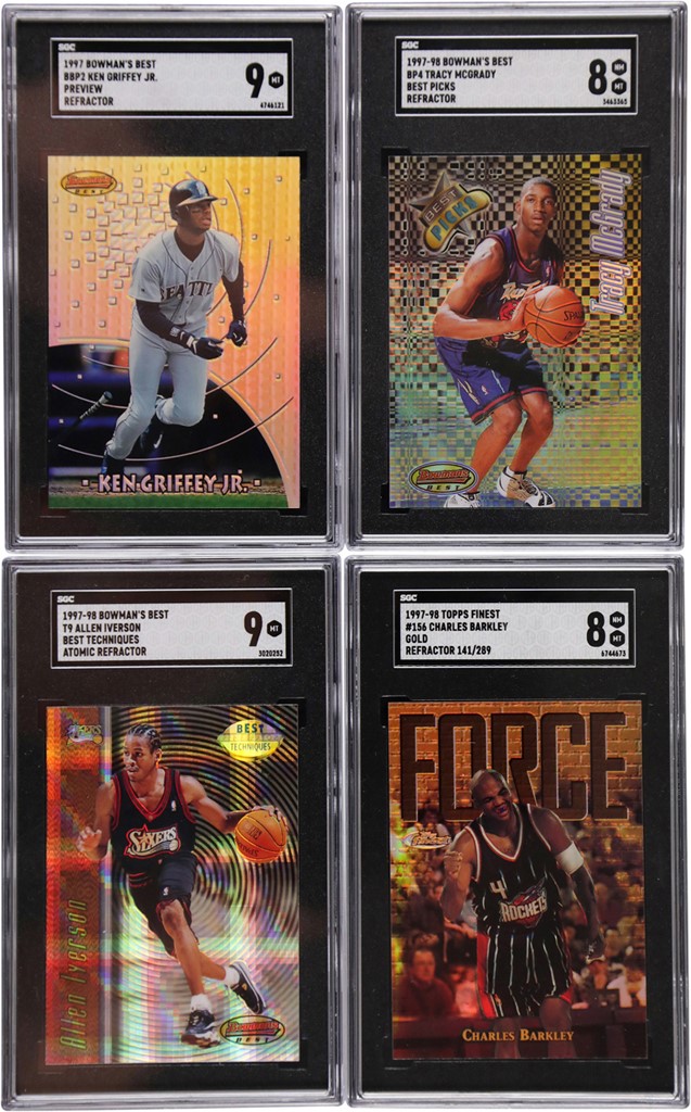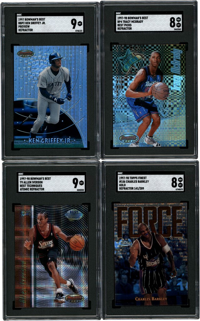 1996-2001 Muti-Sport Refractor collection of (27) cards. Four (4) cards have been graded and encapsulated by SGC with: 1997 Bowman's Best Baseball #BBP2 Griffey Preview Refractor MT 9; 1997-1998 Bowman's Best #BP4 Tracy McGrady Best Picks Refractor (R) NM-MT 8; 1997-1998 Bowman's Best #T9 Allen Iverson Best Techniques Atomic Refractor MT 9; 1997-1998 Topps Finest #156 Barkley Gold Refractor #141/289 NM-MT 8. Ungraded highlights include: 1996 Bowman's Best #178 Dorsett Atomic Refractor; 1997 Topps Chrome Refractor #57 Terell Davis; 1997 Finest Refractor #300 John Elway; (3) 1998 Finest Refractors with #54; #94; #101 Marshall Faulk; (3) 1998 Bowman Chrome with #BCP 5; BCP 6 Brett Favre; BCP 8 Barry Sanders; 1999 Finest Refractor #17; 1999 Finest Prominent Figures Refractor 3PF4; 1999 Finest Main Attractions #MA1 D Sanders/C Bailey; #MA4 M Faulk/E James; 1999 Topps Chrome Refractors with #90 Aikman; #130; #141; #159; 1999 Finest Hall of Hopefuls Refractor #H4; 2001 Topps Chrome Refractor #239; 1998 Mystery Finest Refractor #M19 Barry Bonds; 1998-1999 Topps Chrome Refractor #2; (2) 1999-2000 Topps Chrome Refractor #60; #153. Overall condition of the cards is NM or better.