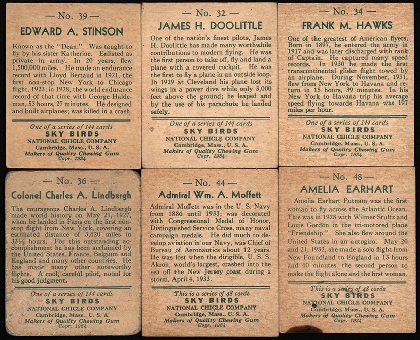 Mixed grade "complete" set of National Chicle Sky Birds, from 1933-34. "Complete" is in quotes because although complete sets of 108 were issued in both 1933 and 1934, this set is comprised of cards 1-24 from the 1933 series and #s 25-108 from 1934. Condition range is 6% EX-MT, 26% EX, 42% GD-VG and 26% lesser. Lot includes four (4) graded cards: #23 (Von Richthofen, PSA 5); #35 (PSA 3); #36 (Lindbergh, PSA 4); and #103 (PSA 3), plus 40 duplicates, among them Lindbergh (FR), Doolittle (2, FR-GD) and Earhart (EX-MT, stain). Beautiful artwork in a popular, seldom-seen set. From From Troup's Trove - a collection of over one hundred HOBBY FRESH complete trading card sets spanning from the 1910s until the 1980s, including some of the most iconic sports sets ever made.