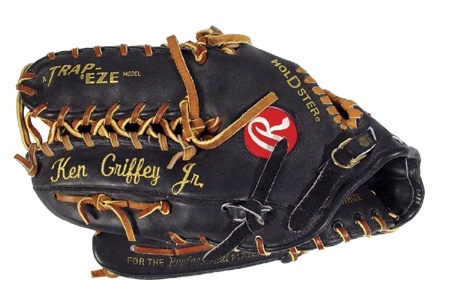 Rawlings “Heart of the Hide” Pro-TB outfielder’s glove was worn by baseball’s “golden boy”, Ken Griffey, Jr. “The Kid” is responsible for single-handedly turning around the Seattle Mariners ball club. His offensive dominance and inspired fielding from CF earned him the reputation of the best player in baseball. He was the first baseball superstar in Seattle, a city that has little or no roots in baseball. However, his desire to play for a championship team resulted in a trade to Cincinnati. Lefty deer tanned cowhide black glove is beautifully laced between the thumb and middle fingers for easy trapping of balls. “Ken Griffey Jr.” stitched in gold on the thumb. Use is evident.