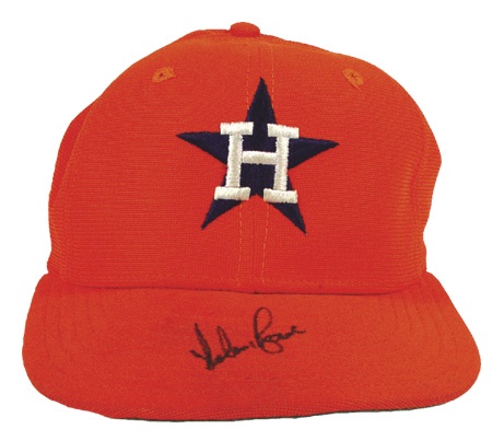 Orange Houston Astros cap belonged to baseball’s first million-dollar-man. The all-time strikeout leader has signed it on the visor. His #34 is barely legible from fading under the visor. Considerable use evident by sweatband around inside of cap. “New Era” tag with [size] 7.25 and MLB flag tags.