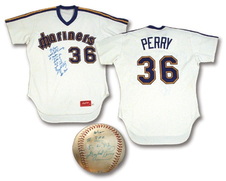 Important historical baseball lot from the man who turned illegal pitches into an art form and a ticket to Cooperstown. This lot includes two incredible pieces from the famed Barry Halper Collection. First, is the jersey he wore to get win number 300. The jersey is a 1982 Seattle Mariners home white jersey with lengthy inscription on the front in blue sharpie, “To Barry, Went last 4 innings vs. Yankees 5-6-82 Seattle 7 NY 3 Your Pal Gaylord Perry #300.” The jersey is a Rawlings size 46, set 1 1982 with “Perry” on the verso. Still has the original auction tags. Second is the ball pitched from the last out on that record setting night. The ball is signed by Perry, “Last pitch made in #300 Randolph hit to 4-3…Win #300 5-6-82 Gaylord Perry.” LOA documents that the handwriting is in fact Gaylord Perry’s. One of the more important baseball pieces that you can actually own. Ex-Barry Halper Collection.