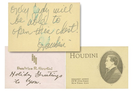From the esteemed Gerald William Burg Visiting & Calling Card Collection with accompanying documentation. Houdini card itself unsigned is valued in excess of $1,000. Face of the ultimate illusionist is brilliantly lithographed on the front with his NYC “Permanent Address.” Signed on the verso blue fountain pen ink with flourishing content, “Only Judy will be able to open this chest! Houdini.” There is a water spot on the inscription and on the signature o/w NRMT. Perfect accompaniment is a business card of his wife Beatrice R. (Bess) Houdini inscribed on the front (Mint, unsigned) “Holiday Greetings To You.” Cards themselves are both NRMT.