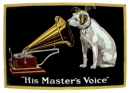 Nipper is one of the most famous dogs of all time, right up there with Lassie and Spuds Mackenzie. The painting of Nipper is based on the original painting done by the dog’s owner, Francis Barraud. The painting was simply called, “Dog Looking at and Listening to Phonograph”. It was later modified to “His Master’s Voice”. After Barraud sold the painting as well as the copyright to the Gramaphone Company in 1899, Nipper became immortalized as the most popular trademark of the advertising world. The RCA Victor logo, featuring Nipper is most common. Porcelain advertisement is well painted, colors are very dark. EX.