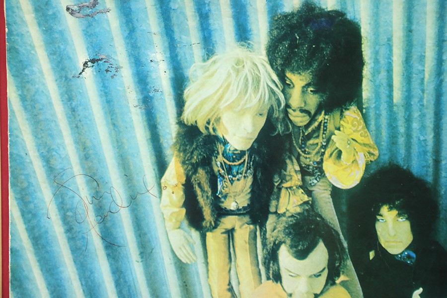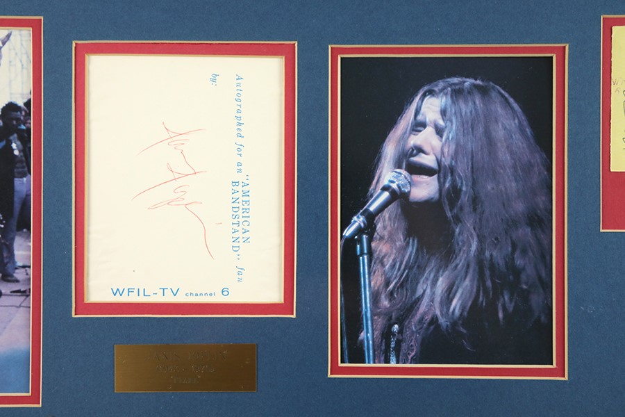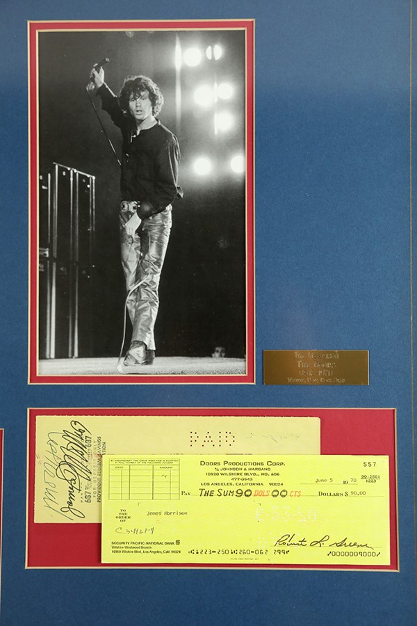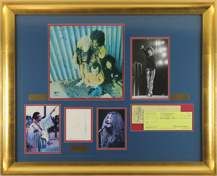 Amazing framed autograph piece from three budding music legends lost in their prime - Jimi Hendrix, Janis Joplin, and Jim Morrison. Nicely framed to 36x29.5", included is a signed cover from Hendrix' Band of Gypsys live album; cut American Bandstand autograph page singed by Janis in red ink; and check endorsed by Morrison. Each has a small plate identifying the autograph of the three Woodstock sensations, all of whom died within 10 months of each other in 1970-71; eerily, each was 27 years of age, giving some legs to the mythical "27 Club" of which they belong, referring to famous people who died at that age. Magnificent display piece.