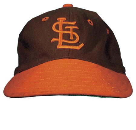 Soft wool cap saw game action in St. Louis. Orange & brown cap with St. Louis logo on front, “Ned Garver” signed neatly under visor in black marker. Considerable use is evident, as the inside leather band is practically falling apart with “Rawlings St. Louis” tag and size 6 7/8 stamped onto it.