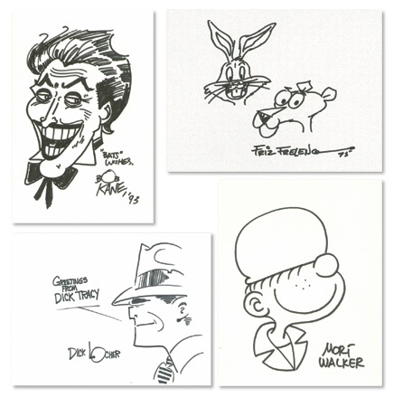 Awesome original artwork of America’s favorite characters, each done by the creators of the original character (each one has been signed by the artist): 1. Dick Locher original “Greetings from Dick Tracy” art in black ink (8.5x11”). Mint condition. 2. Bob Kane, creator of Batman, original sketch of The Joker. Greeting from the Joker is “Bats Wishes” in lower left. Art is dated ’93. 7x10.5”, Mint. 3. James Stewart sketch of movie character, Harvey. Matted to 4.5x7.5”. Mint. 4. Friz Frelong sketch of the Pink Panther and Bugs Bunny. Dated 1975. On 7.5x9.5” paper, Mint. 5. Mort Walker Beetle Bailey black ink sketch. 8x10”, Mint. 6. Handwritten letter from Blaze Starr regarding her encounter with President JFK accompanied by a personal sketch of herself (nude of course). Signed “Love Always Blaze Starr” with her lipstick imprint. Creased once. EX.