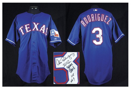 A-Rod represents an unprecedented talent and potential. He is an all-around player of a high caliber, bringing the position of shortstop to a brand new level. He is attached to the most lucrative sports contract in history, a 10-year, $252 million deal of which he is in his second year. Texas Rangers road jersey is signed in perfect black sharpie on the #3 on verso: “Alex Rodriguez 2002 game used HR #9”, denoting his 9th HR of the season, 250th career. “Texas” blazon across the chest. “Rodriguez” on verso. State of Texas flag patch on left sleeve. MLB logo on back of collar. Tagging on inside of front left tail is “Rawlings Authentic Collection” with “set 3 2002”, “[size] 50”, “2-inch extra length”, & “1 inch extra sleeve length” flag tags. Nice use.