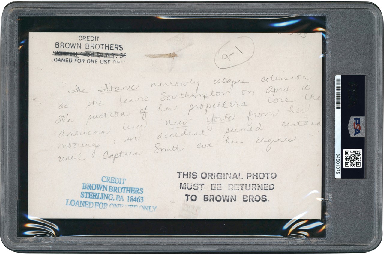 Original Type I photo capturing the Titanic as she sets off on her maiden voyage from Southampton, England, in 1912. Incredibly, the scene pictured here shows a near-disaster averted before the Titanic even set sail. According to the handwritten caption on the reverse, the suction of the Titanic's propellers tore the smaller American liner, the New York, from its moorings and the two vessels almost collided as a result. The photo has been backed with an affixed paper label, but enough of the label around the two bottom corners has loosened that a Brown Brothers credit stamp can be seen on the reverse. The paper label also bears three Brown Brothers credit stamps, along with the aforementioned written caption. The photo (7.75x5") displays two small edge tears, a few light creases, and is affixed to a paper backing. In Very Good condition overall. Culled from the legendary Brown Brothers Photo Archive. PSA encapsulated as Type I Authentic.