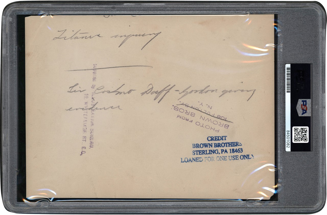 Photo capturing Sir Cosmo Duff-Gordon giving testimony at the British inquiry investigating the Titanic disaster.  A scale model of the Titanic can be seen on the far side of the auditorium. Sir Cosmo Duff-Gordon was a wealthy Scottish sportsman who, along with his wife and her secretary, was a first-class passenger aboard the Titanic during its maiden voyage. Unfortunately for Duff-Gordon, his reputation was tarnished forever when the circumstances of his survival became known. According to other reports, as well as his own testimony, he took refuge in Lifeboat #1 with his wife and her secretary, thereby ignoring the order of women and children first. He also paid the crewman to leave with the lifeboat more than half empty. Although he was officially cleared of any wrongdoing, he was vilified by the press and was never able to clear his name in the court of public opinion. Three Brown Brothers credit stamps appear on the reverse, along with a handwritten caption that identifies Duff-Gordon as the gentleman standing in front of the panel delivering his testimony. The photo (7.75x5.75") displays a few light-to-moderate creases and is in Very Good condition overall. Culled from the legendary Brown Brothers Photo Archive. PSA encapsulated as Type I Authentic.
