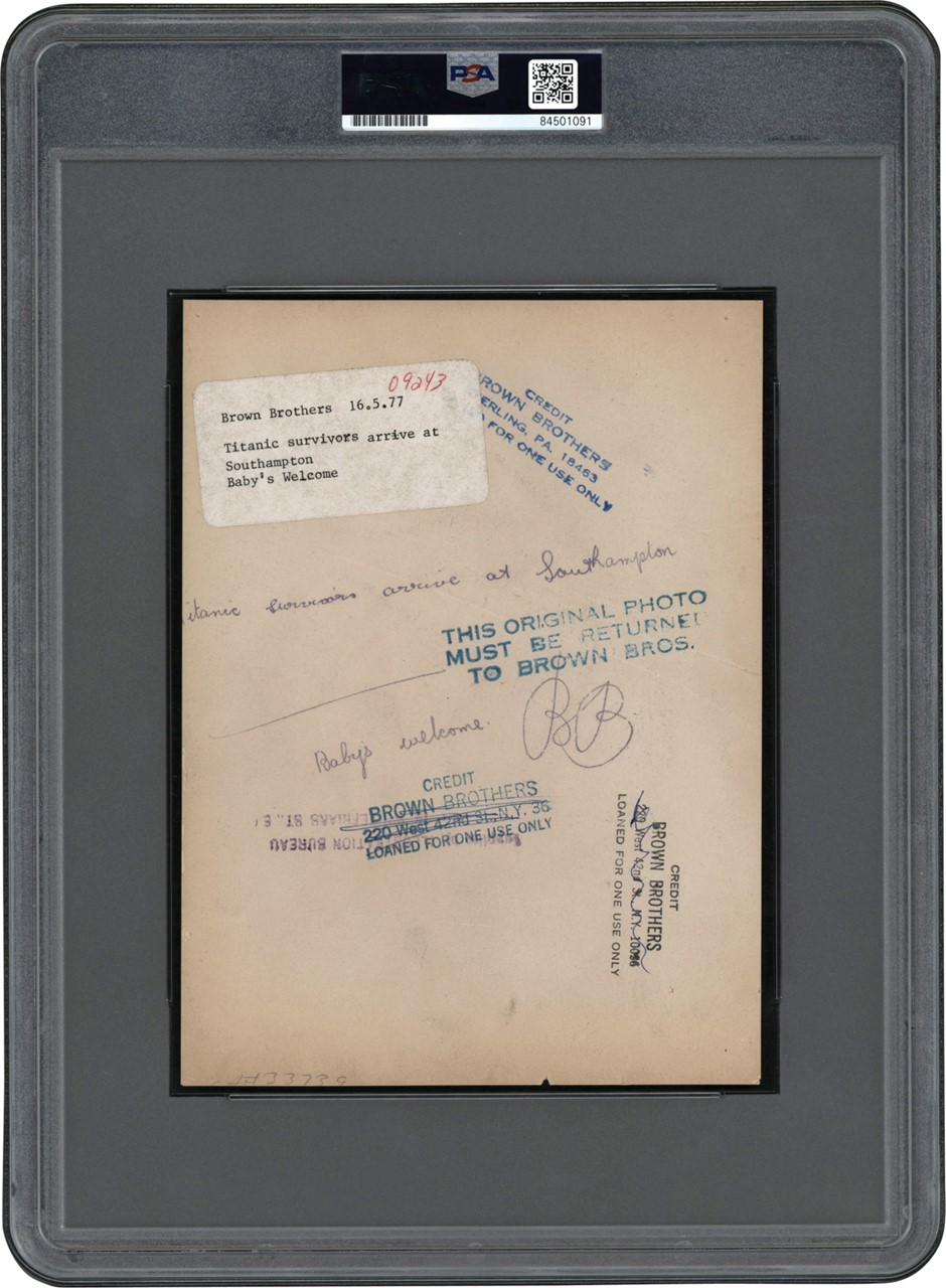 Original Type I photo capturing the crowd awaiting the return of the Titanic survivors in Southampton, England. Southampton was the port from which the Titanic departed on April 10, 1912. Of the over 900 crew members on the Titanic, more than 720 were residents of Southampton. Unfortunately, only 124 of those Southampton citizens survived the disaster. This photo pictures the friends and relatives of those crew members waiting their return, including a crying baby. Five Brown Brothers credit stamps appear on the reverse, along with a descriptive label and handwritten notations. The photo (6x8") displays a small edge tear and a few light-to-moderate creases. In Very Good condition overall. Culled from the legendary Brown Brothers Photo Archive. PSA encapsulated as Type I Authentic.