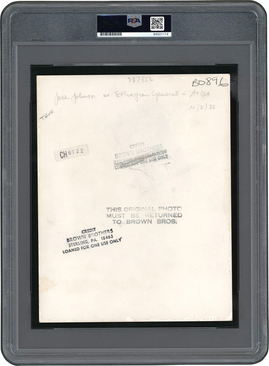 Original Type I photograph of Jack Johnson in costume as an Ethiopian General for his role in the opera Aida. Johnson is pictured posing on stage as he strikes a menacing pose. One of the most controversial and flamboyant sports figures of the early 20th century, Johnson loved being in the spotlight, as evidenced here. The production of Aida that Johnson appeared in took place on October 2, 1936, at the Hippodrome Theatre in New York. Although Johnson claimed to have a fine singing voice, the part of the general was non-speaking role. Three Brown Brothers credit stamps appear on the reverse, along with a written caption and a small, white inventory label. The photo (7x9") remains in Excellent condition. Culled from the legendary Brown Brothers Photo Archive. PSA encapsulated as Type I Authentic.