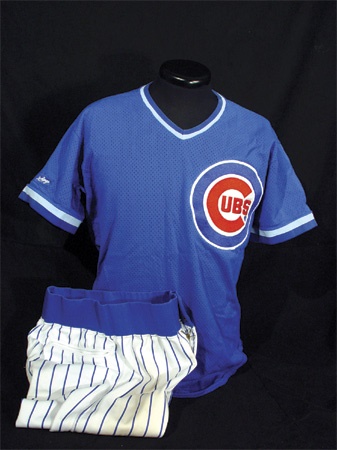 4-time Cy Young Award winner is headed for Cooperstown. What an amazing display of talent and precision. In his wake he leaves these game-used keepsakes. Blue mesh batting practice Chicago Cubs jersey with large circular “Cubs” patch on left breast. His # “31” on verso. “Rawlings” tag inside front tail. Blue pinstripe pants are Set 1 1988 showing nice use. Tagged in waistline with “Rawlings [size] 31” and blue embroidered “31 88 1 31-30 25” on strip tag with “set 1 1988” flag tag.