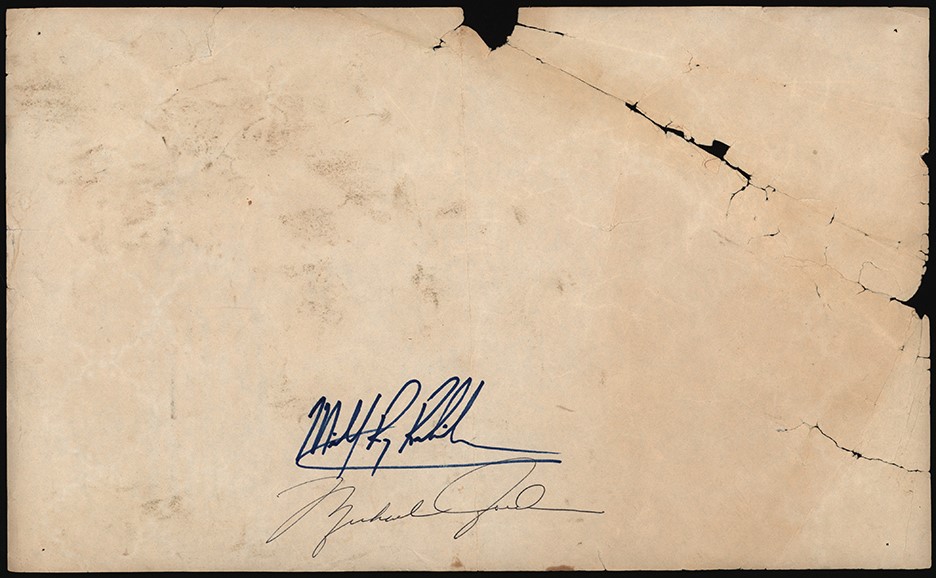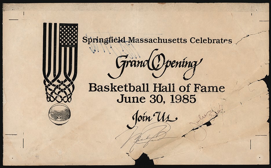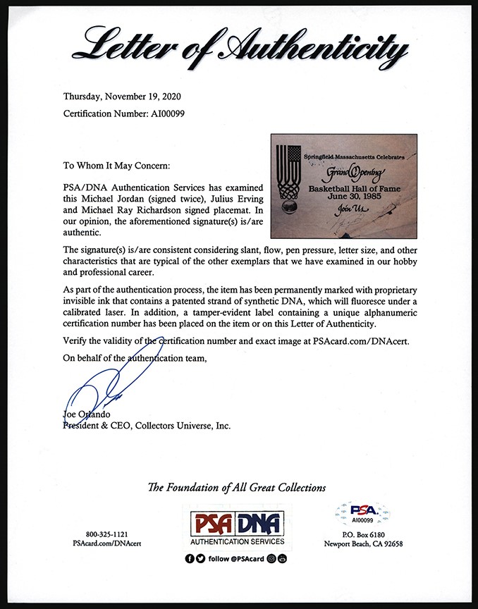 When the Naismith Memorial Basketball Hall of Fame had its grand opening on June 30,1985, in Springfield, Massachusetts, in attendance were future Hall of Famers Michael Jordan and Julius Erving. Now Jordan is often referred to as the Greatest of All Time (GOAT), but back in 1985 he had just finished his rookie NBA campaign with the Chicago Bulls. Down the road would be Jordan's part as a leader of the Bulls' amazing Three-Peat as NBA Champions, a feat the team accomplished twice. No one could dream that the film documentary The Last Dance would help to drive the Jordan legend higher than ever. Julius Erving was the NBA superstar of his era, a 6'7" forward who helped to keep the ABA afloat until some of their teams merged with the NBA in 1976. Erving was known for his acrobatic dunks for the Virginia Squires of the ABA and the New York Nets and Philadelphia 76ers of the NBA. This 13.75" x 8.5" paper placemat was signed twice by Michael Jordan, once on the front and again on the back. Also signing on the front is Erving and also signing o the back is Micheal Ray Richardson, a high scoring guard for the New York Knicks. The placemat shows visible paper loss in a number of areas. Included is a PSA Letter of Authenticity.