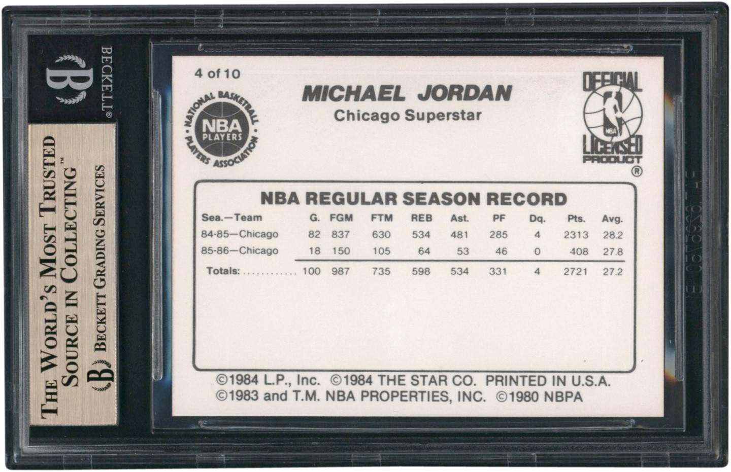 1986 Star Michael Jordan #4 Michael Jordan has been graded GEM MINT 9.5 by BGS with 9 Centering, 9.5 Corners, 9.5 Edges and 9.5 Surface.