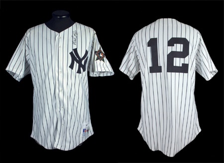 Boggs made his first of 4 consecutive All-Star starts in Yankees pinstriped uniform with this jersey. One of the most quirky & superstitious players in the history of baseball was also among the most consistent and productive, a base hit machine with 7 consecutive 200-hit seasons. New York Yankees All-Star pinstripe with “NY” logo on left breast, “12” on verso. “Baltimore Orioles 1993 All-Star Game” patch on left sleeve. Black sharpie signature on front rest just below the collar on left side. Excellent game use throughout jersey. Front left tail tagging is “Russell Athletic Diamond Collection [size] 46” with “100% polyester” flag tag & “1993” year tag. Obtained from B.A.T. auction held at the 1993 All-Star game.