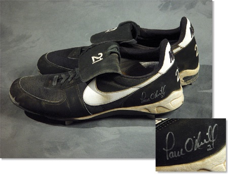 The tremendous footprints, left by O’Neill, that remain in the Yankee right field will not be easily filled. A powerful and integral part of the Yankee’s championship machine, Paul’s recent departure from the game has prompted talks of retiring his number. Black “Nike” spikes are size 11 with number “21” embroidered on lace guards and back. “Paul O‘Neill, 21, Game used ‘99” in silver sharpie on outside heel of both, with additional “Game used 99’ on right cleat. Terrific use.