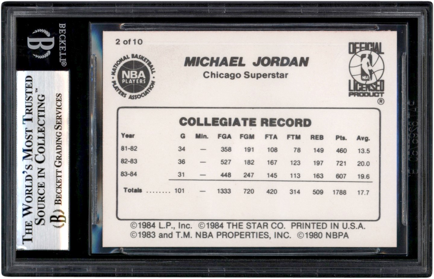 1985-1986 Star Co Basketball Michael Jordan #2 Collegiate Stats card. The card has been graded and encapsulated by BGS NM-MT+ 8.5 with sub-grades of centering 8.5; edges 9; corners 8; and surface 8.5.