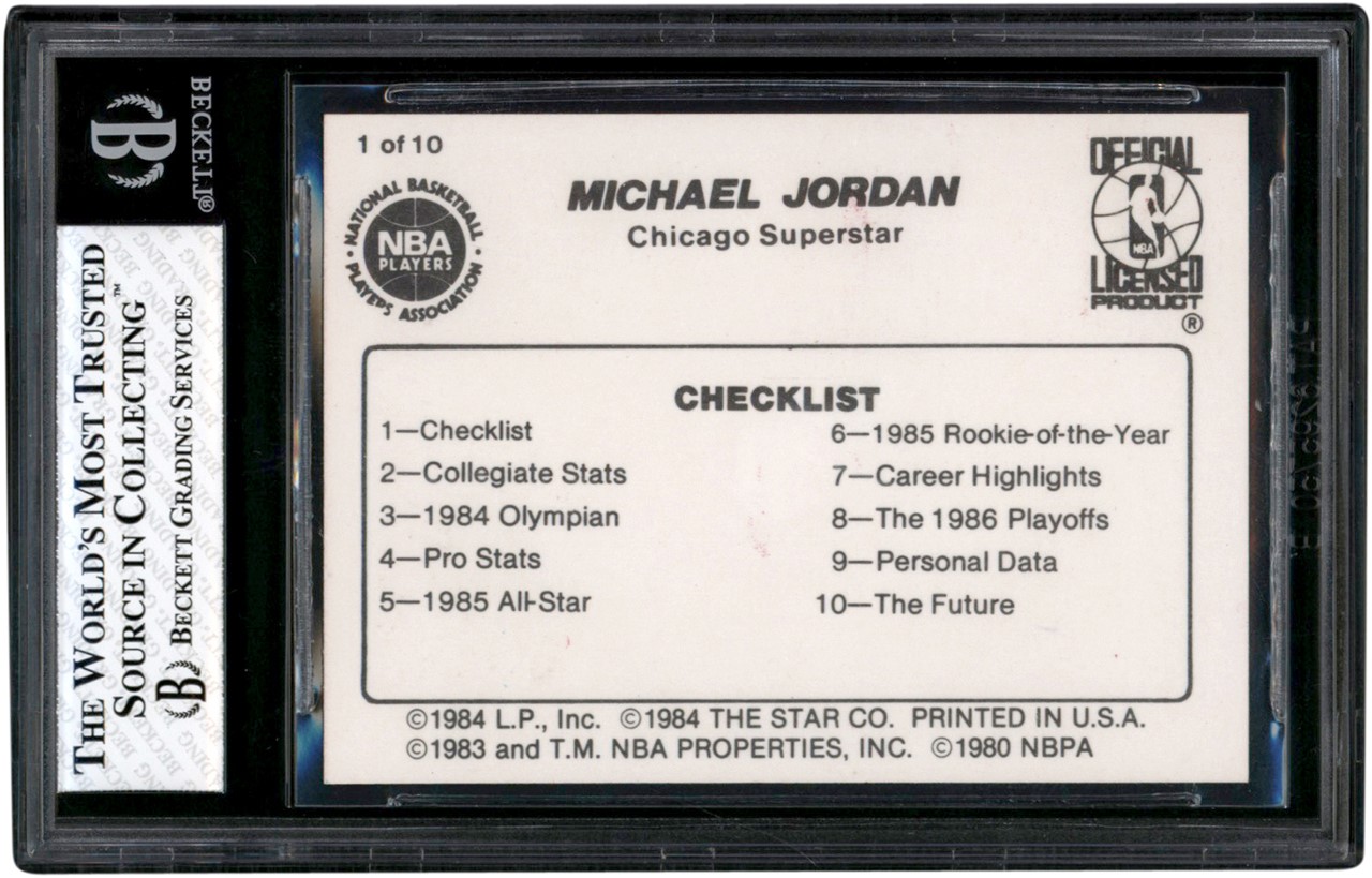 1985-1986 Star Co Basketball Michael Jordan #1 Michael Jordan Checklist card. The card has been graded and encapsulated by BGS NM+ 7.5 with sub-grades of centering 9; edges 8; corners 7; and surface 8.