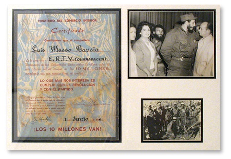 Large display piece contains photo of Fidel Castro (matted to 7.5x9.5”), photo of Castro with guerillas (matted to 5x7”), and a certificate, signed by Castro from the Ministry of Internal Commerce. Official document pertains to the 1969 and 1970 Zafra and the importance of the economy by way of cutting sugar canes.