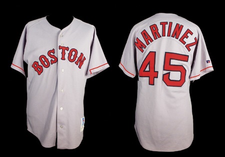 Gray road Boston Red Sox jersey worn by 3-time Cy-Young award winner. One of the most feared pitchers in the majors, he possesses an overpowering fastball, and one of the best sliders around. This ace was the first Red Sox pitcher to lead the AL in wins, ERA & strikeouts since Cy Young himself. Jersey is well used, both sleeves cut on the underside to allow for free arm movement, a patented Pedro practice. “Boston” stitched across the chest, “Martinez 45” large on verso. Russell Athletic emblem on right sleeve. Front left tail tagging is “Russell Athletic Diamond Collection [size] 44” with “1998” printed on strip tag below and a “100% polyester” flag tag. Strong use.