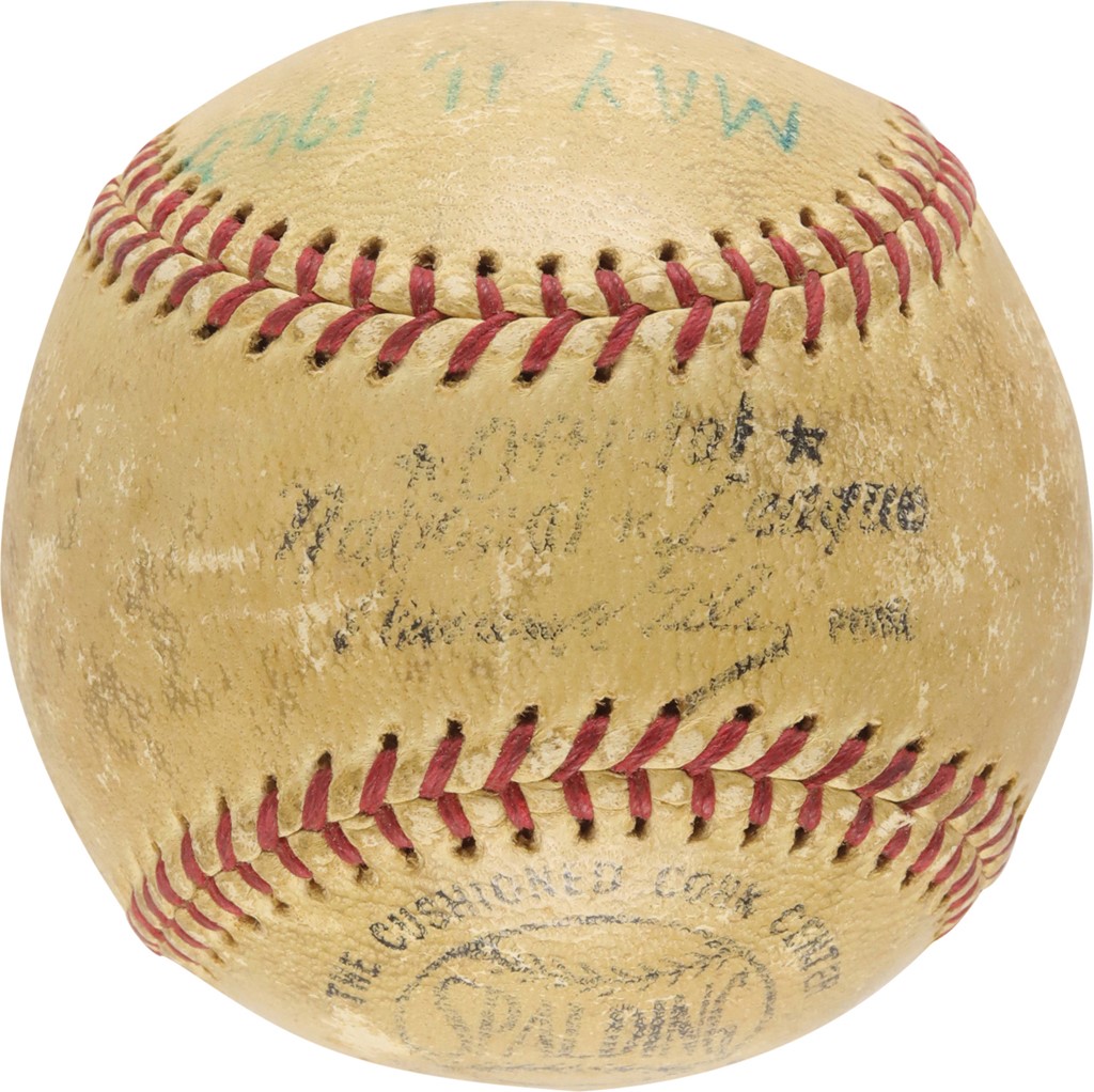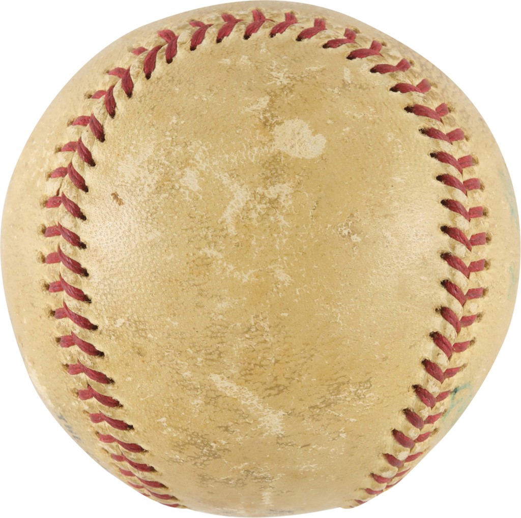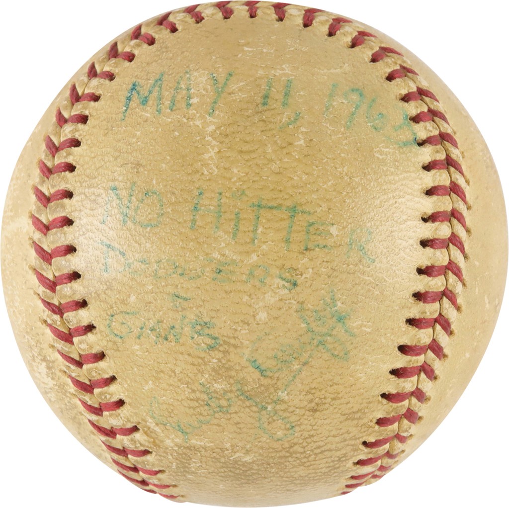 Displayed is a signed game used baseball from Sandy Koufax from the Hall of Famer's second no-hitter, pitched on May 11, 1963, at Dodger Stadium. A crowd of 55,350 was in the stands as the Los Angeles Dodgers hosted the rival San Francisco Giants. The Dodgers led 1-0 until they scored three times in the sixth inning to take a 4-0 lead. Going into the eighth inning, Koufax was pitching a perfect game. Sandy walked Ed Bailey with one out in the eighth to lose his perfect game, but he hung on, despite not having his best stuff, to complete the no-hitter as Koufax threw 111 pitches, and struck out only four to defeat Juan Marichal by a score of 8-0. Koufax had four no-hitters, and one of those, on September 9, 1965, against the Chicago Cubs, was a perfect game. Koufax was a part of three Dodger World Series championships, including one in this 1963 season. He also was the National MVP in 1963 and won that year's Cy Young Award, and the Pitching Triple Crown, as he went 25-5, with 306 strikeouts and an ERA of 1.88. The consignor's husband was gifted the ball by Marshall Berle (nephew of Milton) when he was a kid. The handwriting, by an unknown hand, reads, " "May 11, 1963, No Hitter, Dodgers + Giants". The ball is signed by Koufax underneath the inscription. It is an Official National League ball showing appropriate use. The signature shows fading but is still legible, and it rates 5/10. The ball is in good condition, and it shows appropriate use. The valuable ball comes from one of the highest achievements by one of the best pitchers of all time.