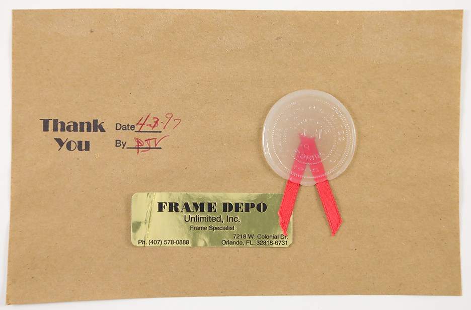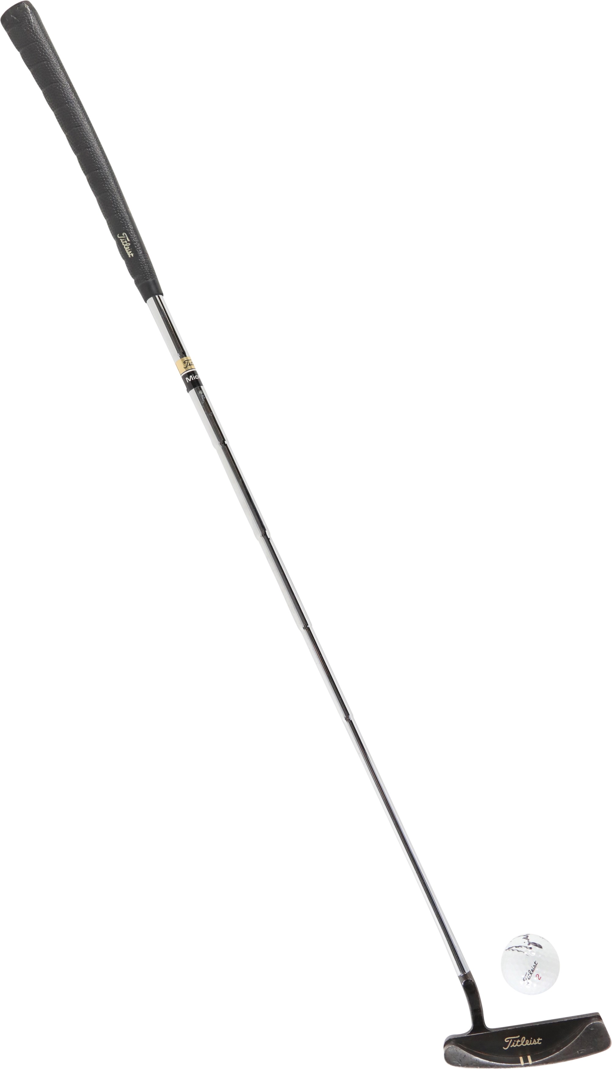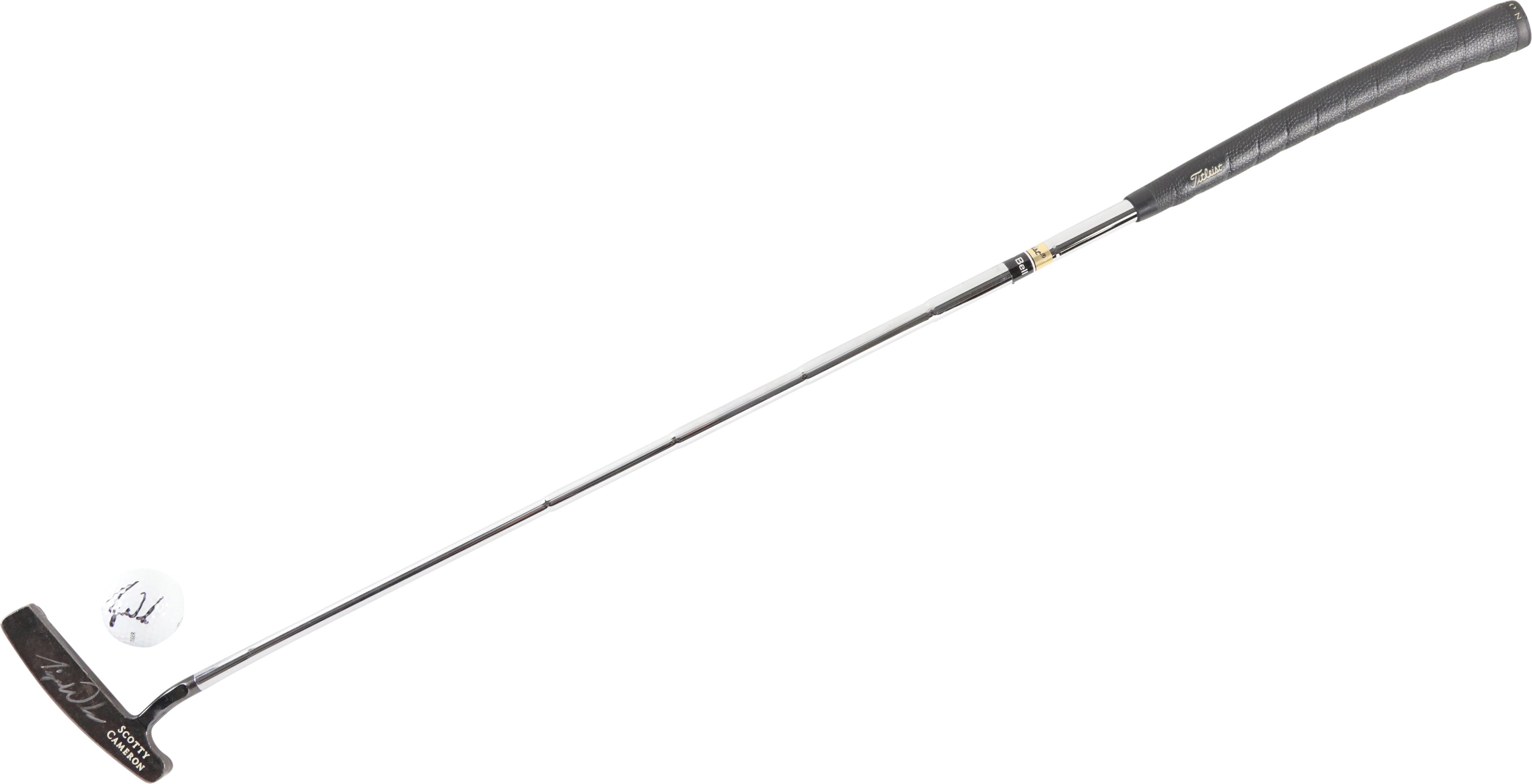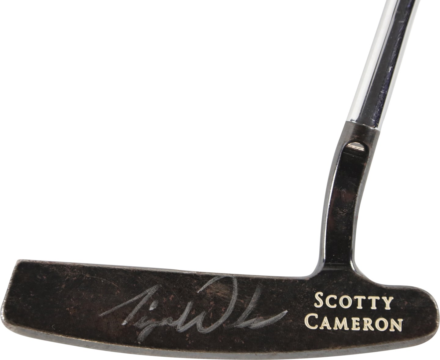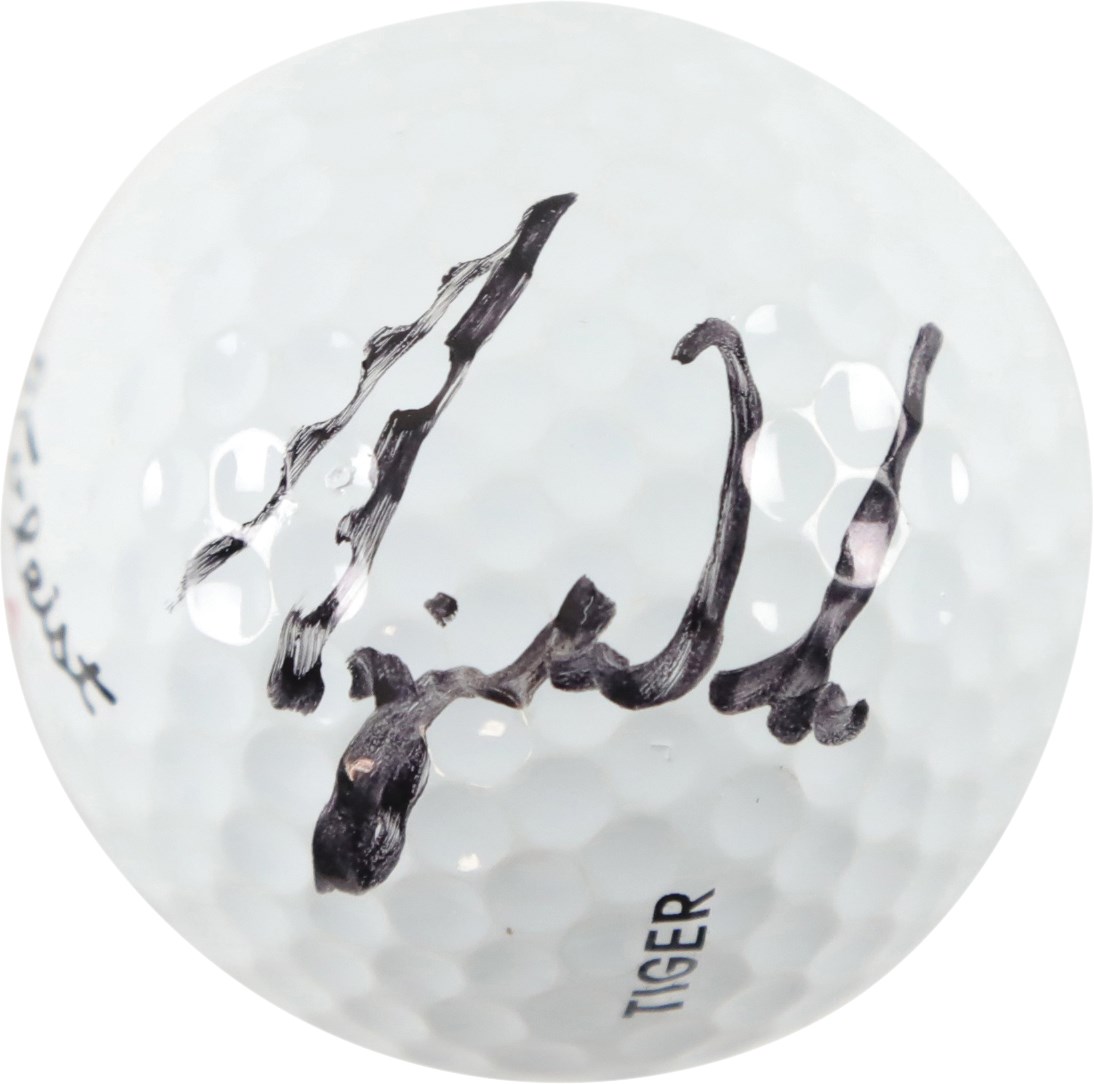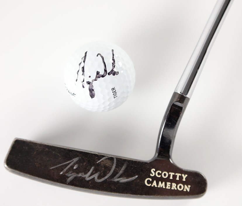 "As you all know," said Tiger Woods, "I'm kind of a perfectionist." The only questionable part of the aforementioned quote is Tiger's use of "kind of" to describe his perfectionism. Woods himself would almost surely admit that he is an all-out perfectionist if there ever was one. His work ethic is legendary, and his desire to perfect his game helped to push Woods into an amazing comeback in the recent April 7-10,2022 Masters Tournament in Augusta, Georgia. Woods suffered serious leg injuries in his February 2001 single car crash in California. He had rods and pins placed in his right leg, and he went over 16 months away from golf. Still not match fit and hampered by the walking he had to do in the tournament, Woods surprisingly made the cut on Friday, April 7th, the second day of the Masters, but his legs evidently increasingly bothered him, and he shot a six-over par 78 on both weekend rounds. Woods is now officially back as a PGA golfer. He may play in the May PGA Championship in Tulsa, Oklahoma, and he has stated that he will play in the Open championship in July at St. Andrews in Scotland. In his career, Woods has won 82 PGA events, tied for first place all-time with Sam Snead. Woods has won 15 Major championships, second only to Jack Nicklaus, with 18. For a very brief moment in time, Woods used this Scotty Cameron putter (approx. 35" in length) with a flow neck, which Titleist confirmed was a Laguna model. The bottom of the putter reads "Scotty Cameron Laguna by Titleist." The back of the putter has "Scotty Cameron" imprinted and Tiger Woods' signature in what appears to be written with a silver marker. The putter is in excellent condition. Woods had the Laguna in his bag for the 1997 Buick Open at Warwick Hills Country Club in Michigan, but it looks as though it never made it back into the starting 14-club roster after that. The putter comes with a vintage signed "Tiger" golf ball that was possibly used. Tiger signed the putter and ball in 1997. Putter and ball were previously displayed with date "4/3/97" on back, so the putter was used before that date. Our consignor was good friends with Tiger Woods as they frequently played golf together. One day after their time on the course, Tiger reached into his bag, signed this Scotty Cameron putter and ball and gifted it to the consignor. The Titleist 2 golf ball has "Tiger" imprinted on it and Woods signed with a black marker. The ball is in excellent condition. Obtaining this item will not only give a collector both a used putter and a possibly used golf ball, both signed by possibly the greatest golfer in history, but help a great cause as, please note, proceeds of this sale will be donated to a non-profit foundation that is currently working on building a school for autistic children.