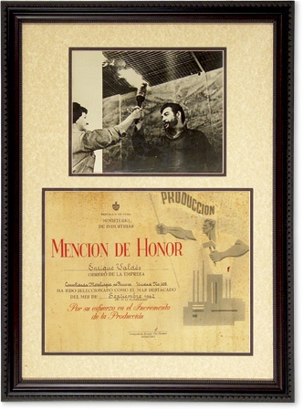 Fabulous vintage photo of the hero to the New Left Radicals (matted to 8x10”). Below is a Republic of Cuba / Ministry of Industries diploma signed by the Latin American guerilla leader. Diploma was for a worker of the company “[translated] for his effort in increasing production”. Dated 1962, diploma (matted to 10x13.5”) has severe creasing. Presented nicely in frame (19x25.5”).