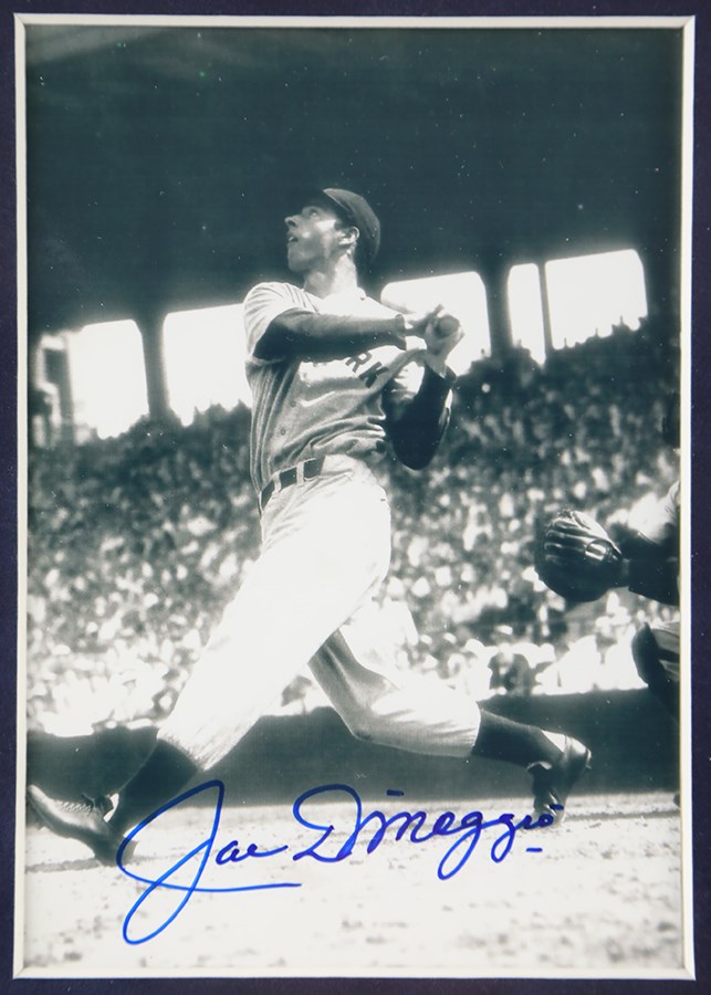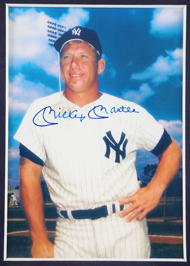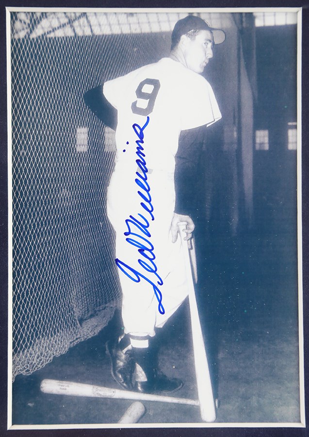 Framed display featuring signed photos of Mickey Mantle, Ted Williams, and Joe DiMaggio. Each 5x7" photo has been boldly signed by the respective player in blue Sharpie, with all the signatures grading 10/10. The photos are all in apparent Mint condition and have been matted and framed together with representations of each player's respective uniform number. Total dimensions: 21x18".