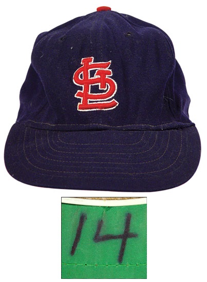 Acquired from his last year as a Cardinal, nice navy St Louis cap conjures up memories of his invaluable contributions to the Cardinal club. This All-Star 3rd baseman was signed as a pitcher, but his performance on the mound got him moved to 3rd base. 5 Gold Gloves later, he had hit 255 HRs for the Cardinals. #14 under visor is still nice and bold. “Harry Walker Pro-Model” is 100% wool, size 7-1/4. Nice use but in great shape.