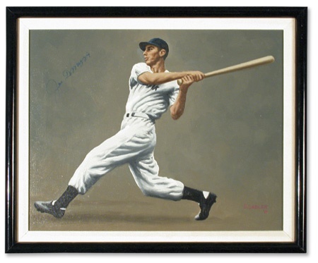 DiMaggio in classic follow through depicted accurately in this original painting by Erwin Sadler, dated 1991. DiMaggio has signed the work in blue sharpie. Nicely framed. Mint. Scoreboard COA.