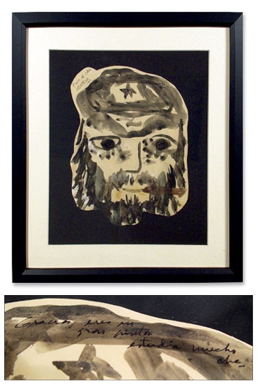 Child painting (matted to 9.5x11”) supports the idea that ‘Che’ Guevara is the most recognizable face in the Western world, especially among the younger generation. Painting bears strong resemblance to the famed revolutionary. Timeless, it has been signed by both the young student as well as Guevara. Dedicated, “Para el Che, Albertico”. Signed by Che [translated]: “Thank you, you are a great painter. Study Hard – Che”.