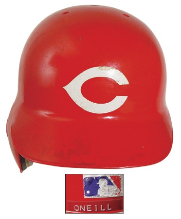 Early on in his career, Paul O’Neill was compared to Ted Williams. He had great power and was capable of producing big numbers. He was hampered somewhat by hand injuries, but continued to produce for the Yankees, hitting well in clutch situations. Batting helmet emanates from his 1991 season with Cincinnati. Good use and wear to helmet with “O’Neill” on dyno tape on back. Size 7 3/8.