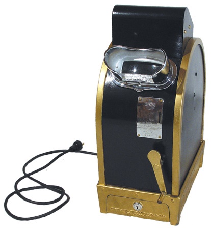 Fabulous electric machine is a coin operated crank, which allowed viewers to witness a host of different movies, images and even play games. The reel in this particular machine is a “Bombs Away” wartime theme from WWII. The reel itself is worth $400-$500! In complete working condition, the mutoscope has been restored to a stunning EX-MT condition. Painted black with gold painted trim, this lovely apparatus sitting atop a large stand measures an impressive 5 feet tall, the ideal height for viewing while standing. “Manufactured by International Mutoscope Corp. Long Island” stamped onto metal plate below lenses.