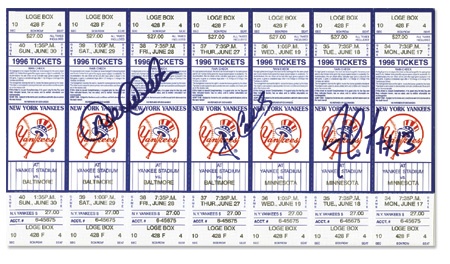 Contains 81 tickets altogether with 30 blue sharpie signatures altogether including Torre, O’Neill, Jeter, Gooden, Boggs, Pettite, Rivera, Fielder, Wetteland, B Williams, Raines & Cone. EX-MT.