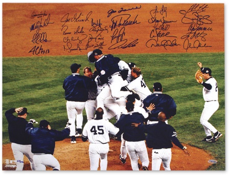The Bronx Bombers close out the 20th century with yet another World Series sweep, their third in 4 years. Great full color photo of Yankees teammates charging mound after final out to congratulate WS MVP, Mariano Rivera, who gets the save. 26 blue sharpie signatures include Jeter, O’Neill, O. Hernandez, Rivera, Torre, Williams, & Cone. Print is noted as 63 of 199. Mint. Steiner certificate.
