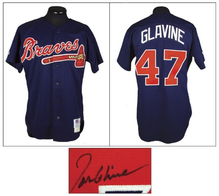 He was a member of the Fab 4, but his band members’ names were Smoltz, Avery, & Leibrandt. He is now one of the finest pitchers in the major leagues. Beautiful jersey is an all original, dark navy alternate with “Braves” and tomahawk across the chest. “Glavine 47” on verso with black sharpie signature on the “7”. “Russell Athletic Diamond Collection [size] 42” tag on front left tail with “100% polyester” flag tag & [year] 95 strip tag.
