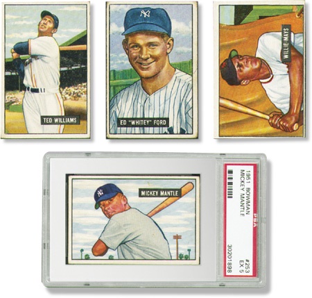 One of the best sets of the ‘50s. Complete at 324 cards. Set includes a crucial pair of Hall of Fame rookie cards, Mays & Mantle, and many other Hall of Famers. Conservatively grades at 10% EX-MT, 70% EX to EX+, and 20% VG to VG-EX. The high numbers are slightly nicer than the low number series. The key card in the set is the rookie card of one of baseball’s most loved players of all time, Mickey Mantle. This solid example features a bright image of Mantle with almost perfect centering. We had it professionally graded a PSA 5 (EX). The other key cards to the set are #1 Whitey Ford rookie (VG), 2 Berra (Good), 26 Rizzuto (VG-EX, light paper wrinkles), 30 Feller (VG-EX, light wrinkle), 31 Campanella (VG+, creased across the back), 32 Snider (VG-EX), 80 Reese (VG), 165 Ted Williams (VG-EX+), 198 Irvin rookie (EX), 232 Fox rookie (VG-EX+), 305 Willie Mays rookie (EX, o/c), 306 Peirsall rookie (EX-MT, o/c). With a few upgrades of some of the stars, this set could average a solid EX to EX+.