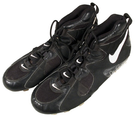 Baseball’s dynamo used these cleats while he was proving his worth as the most talented shortstop in the game. Signed in perfect silver sharpie on each cleat just below the Nike swoosh, these size 12’s show some good use. “A-Rod” stitched onto the heels. Anything from this young star is as good as gold. Bank on it! LOA.