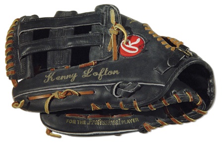 The most dangerous lead off man of the 90’s uncanny ability to steal spans two sports (Lofton is also Univ. of Arizona’s all-time steals leader for basketball) Kenny has been the sparkplug in the high powered Indians’ offense for the last decade. Black “Rawlings Pro2-HFB” glove shows heavy game use. “Kenny Lofton” embroidered in gold thread on thumb to match the shimmering, gold “Rawlings” patch. Strong use.
