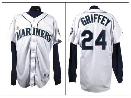 One of the few modern all-around players in the majors gives up his game worn Seattle Mariners jersey from ’98 along with his turtleneck. “Mariners” across the chest and “Griffey 24” on verso. Seattle Mariners circular patch on left sleeve. Tagging on front left tail is “Russell Athletic Diamond Collection [size] 46” with 100% polyester & 2” extra body length flag tags. “1998” year tag. Nice use.