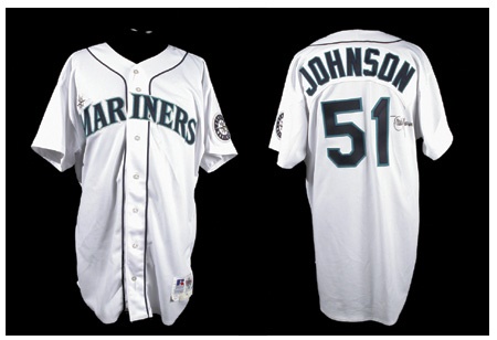 With a scowl that could scare the Grim Reaper himself, you can imagine the emotions Randy Johnson stirs in opposing batters. Standing atop a mound that only adds to his intimidating 6’10” frame, launching 100 mph fireballs and sliders with “improved” control you can understand why Johnson has been labeled the most intimidating pitcher of all time. Home white jersey, shows nice use, with “Mariners”, across chest and, “Johnson, 51” on back. Beautiful black sharpie signature on back. “Seattle Mariners” patch on left sleeve. Tagging on front left tail is “Russell Athletic, Diamond Collection, [size] 50” with “96” year tag, 100% polyester & 3” extra length flag tags. Good use.