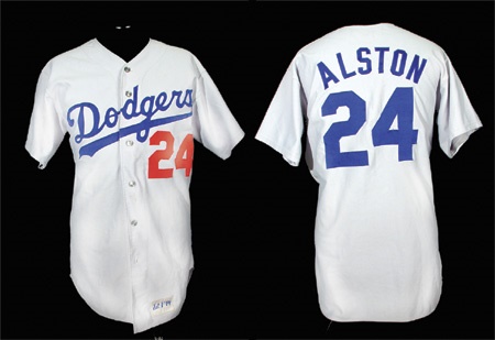 He may have struck out in his first-and-only Major League at-bat, but Smokey would prove to be a Hall of Fame manager for the Dodgers, winning 7 pennants in his 23 years as a manager. Dodgers road gray jersey was worn by Alston en route to their third straight World Championship. “Dodgers” embroidered across the chest in red, “24” in red underneath left breast. “Alston 24” on verso in blue. “W.A. Goodmaker & Sons [size] 46” tagged in collar. “Set 1 ‘74” embroidered in bold, thick stitch on plate on front left tail. Strong use.