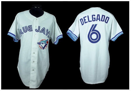 The leader of the Toronto Blue Jays’ offense is now the Jays’ all-time HR leader after surpassing Joe Carter in 2001. Home white jersey with “Blue Jays” blazon across the chest with bird logo on left breast. “Delgado 6” on verso. Collar tagging is “Wilson [size] 48” with “6 95 2” embroidered on plate. Nice use.