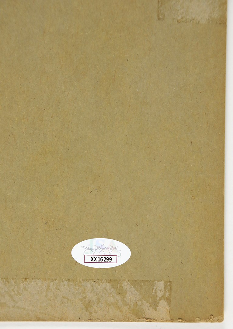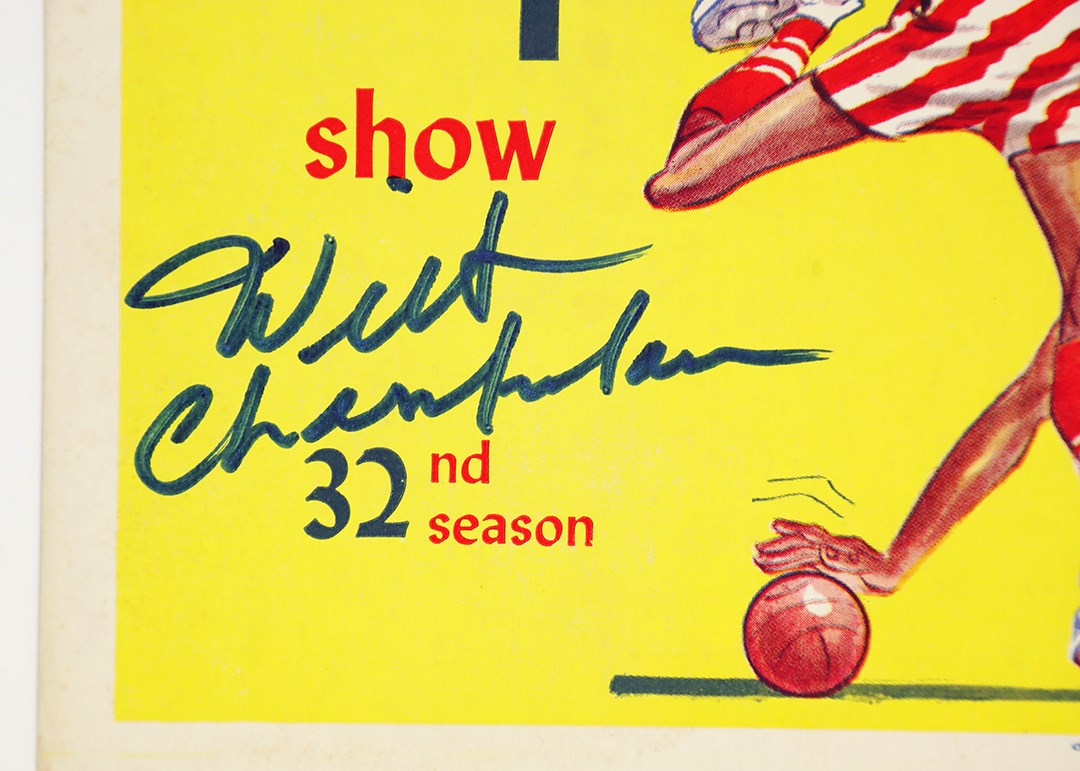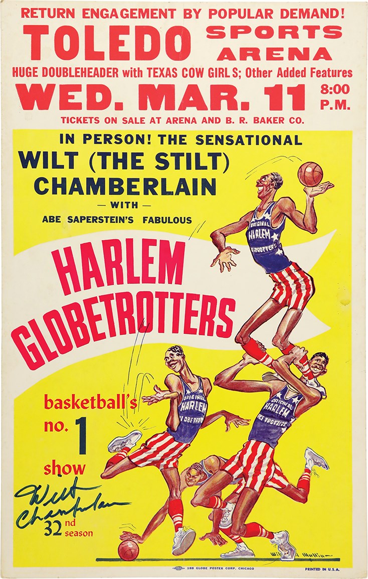 1959 signed broadside poster heralding the Toledo, Ohio "Return Engagement by Popular Demand" of the one and only Harlem Globetrotters. Bright colors highlight this magnificent 14x22" piece, which included "The Sensational Wilt (The Stilt) Chamberlain" playing with "Abe Saperstein's Fabulous" Trotters. Wilt is one of four players illustrated in caricature, fittingly holding up Meadowlark Lemon, and Chamberlain boldly signed the bottom right corner in 9/10 blue marker. Back is blank and has paper loss at the edges from tape removal, none of which shows up on the front. There is some rounding and minor creasing along the edges with some very minor scattered stains; it is hard to imagine another specimen of this nature that has survived in better shape. Chamberlain's lone full season in the red, white, and blue was in 1958-59 as he left college after his junior year and the NBA was not allowed to draft players before their class graduated; Wilt did occasionally join the team during the off-season in future years. Comes with PSA LOA for autograph.