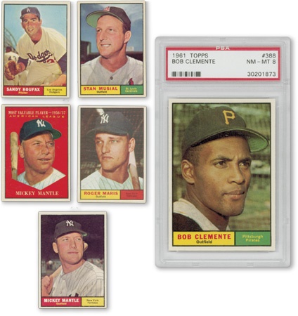 Set is led by #388 Roberto Clemente graded PSA 8 NM-MT. Overall the set averages EX-MT to NRMT+ with some NM-MT examples throughout! The high-numbers are equally as nice as the balance of the set. Set contains 582/587 cards. Lacking numbers 307, 476, 527, 578 (Mantle All Star), and 579 (Mays All Star). Some of the key cards grade as follows: #2 Maris (EX+), 150 Mays (NRMT, o/c), 290 Musial (EX-MT+), 300 Mantle (NM-MT, printer’s marks), 344 Koufax (NRMT+), 350 Banks (NM-MT, o/c), 406 Mantles Blasts (NRMT+), 417 Marichal rookie (NRMT), and 475 Mantle MVP (NRMT).