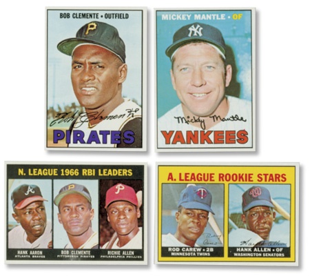 Set contains 567/609 cards. Missing 42 cards including #456 Niekro, 581 Tom Seaver’s rookie, 600 B. Robinson, and 604 Red Sox Team Card. 31 of the cards that are missing are from the high number series. Key cards grade as follows: #150 Mantle (NRMT+), 200 Mays (NRMT, o/c), 242 N.L. RBI Leaders (NM-MT), 250 Aaron (EX+), 355 Yaz (NRMT o/c), 400 Clemente (NRMT+, o/c), 569 Carew rookie (NRMT+, well centered), and 580 Colavito (EX-MT). Set averages EX-MT to NRMT with some NRMT+ to NM-MT examples throughout.