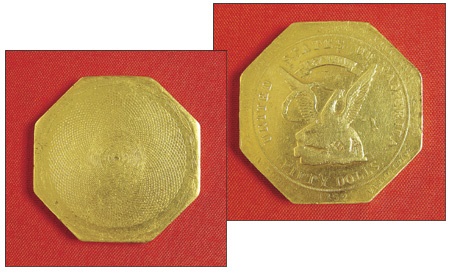 A truly special and valuable piece symbolizing a defining event in 19th century America. Following the California Gold Rush of 1849, $50 gold slugs, A.K.A. “ingots”, or “Californians”, like this one, were introduced as a way to purify the gold coin market. Gold dust dealers could no longer pass debased gold coins as currency, as its contents were required to be readable on the coin itself. From 1851-1853, these octagonal ingots, 2.5 ounces of gold, were the principal accepted currency in California (along with larger denominations of gold slugs). The edges on front of slug are stamped, “AUGUSTUS HUMBERT UNITED STATES ASSAYER OF GOLD CALIFORNIA 1852”. A wonderfully unique and highly recognizable piece. Rest of front is bald eagle surrounded by words “United States of America 887 Thous Fifty Dolls”. Reverse is target (fully intact) measuring 16mm, 22 circles surrounded by elaborate net design. Americana design on border. In very fine condition, free of the typical edge bumps and nicks. Only slight tarnishing, if any at all. “Go west, my young man” and own a piece of American history. Scarce.