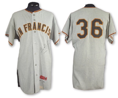 Changing the face of pitching and the way modern baseball was played, talented “spitballer” won 314 games over his 22 years in the majors. Fabulous gray road San Francisco Giants flannel jersey is signed right on the front in black sharpie (9/10). “San Francisco” blazon across the chest. His “36” on verso. “Perry” is embroidered in black thread on felt patch in collar with “36” handwritten (vintage) in black marker to the left. On the right side is handwritten “46”. Both markings are considerably faded. Front left tail tagging is “Rawlings [size] 46” with “67” and “46” embroidered onto jersey below. Below that is care tag with “set 1 1967” on year tag. Strong use throughout jersey. Numbers and lettering are slightly faded from age. LOA. Included is an autographed color photo (8x10”) of Gaylord Perry wearing similar jersey.