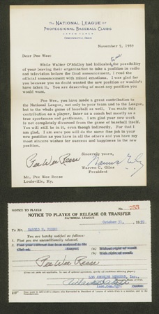Historically significant documents pertain to the release of the Little Colonel from the organization to which he had been a defining presence. Player release form is dated October 31, 1959 and is signed by Pee Wee and the Dodgers’ Asst. General Manager. Paper measures 4x6”. EX-MT. Letter dated November 9, 1959 is from President, Warren C. Giles, thanking Reese for his contribution to the League as well as baseball. Although the first part of the letter expresses mixed emotions regarding Pee Wee’s decision to enter radio and television, Giles ultimately extends a fond blessing to Reese: “Pee Wee, you have made a great contribution to the National League, not only to your team… but to the whole game of baseball as well. You made this contribution as a player, later as a coach but mostly as a true sportsman and gentleman. I am glad your new work is not completely divorced from the game of baseball itself. You will still be in it, even though indirectly. For that I am glad. I am sure you will do the same fine job… as you have in all the other [positions] and you have my sincere wishes for success and happiness.” Signed by both Reese and Giles at the bottom. Letter is typed on “The National League of Professional Baseball Clubs Carew Tower Cincinnati, Ohio” stationary (6x8”). Staining mostly to the verso, comes through slightly on the front edges. Letter is folded in the middle, o/w in NRMT condition. Two important documents defining the end of an unforgettable era in Dodgers history.