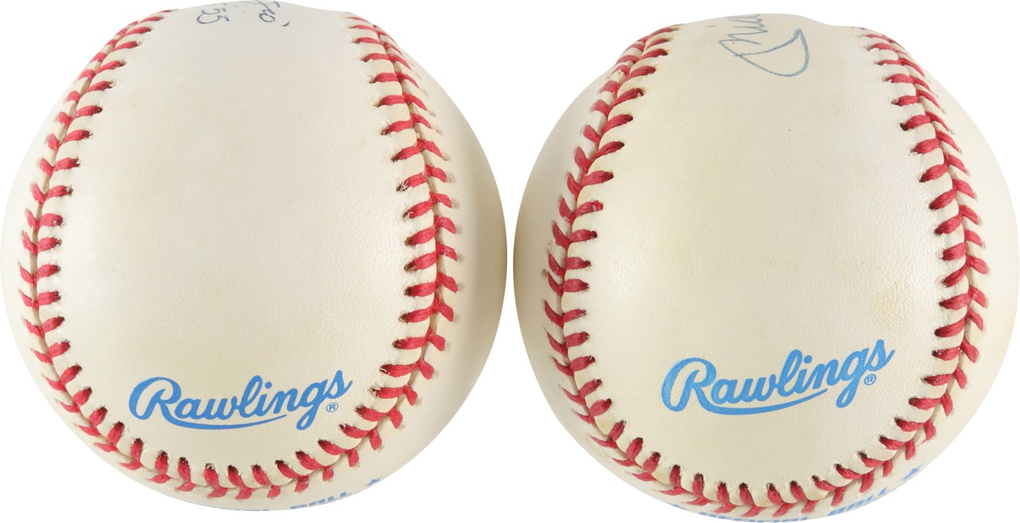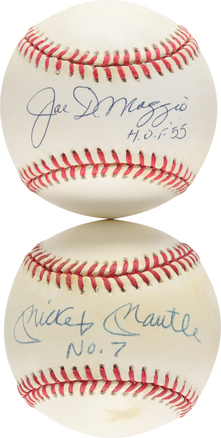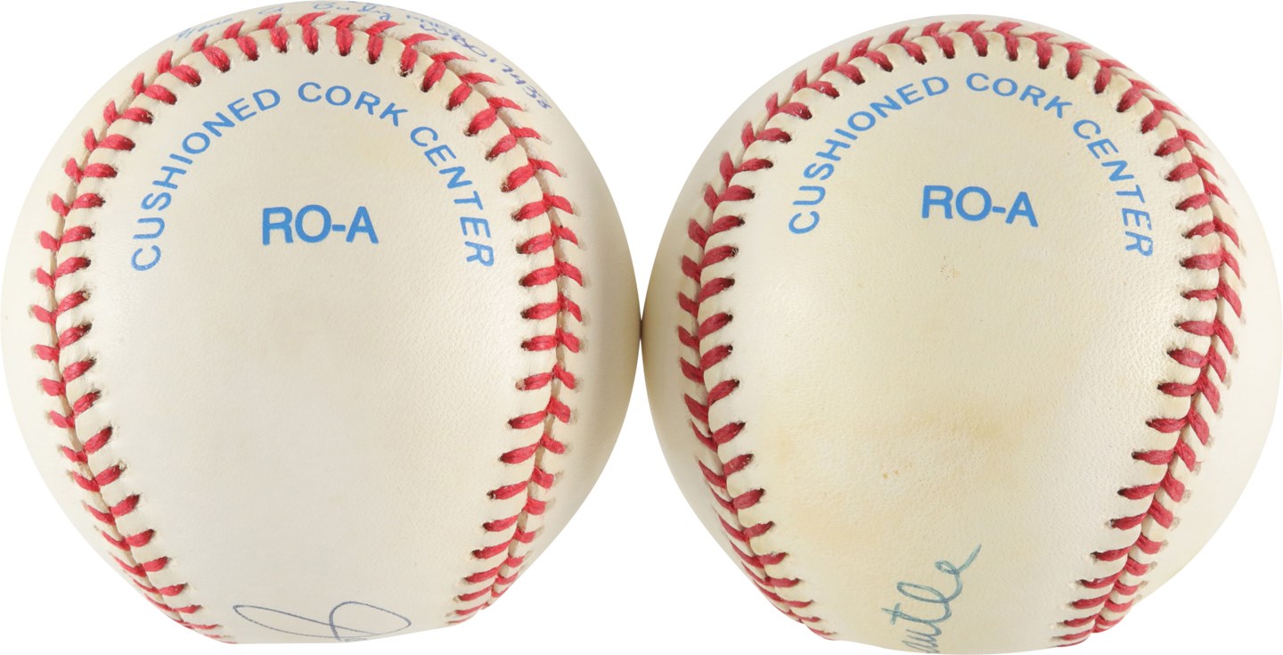 Lot # 470: *** Mickey Mantle and Joe DiMaggio Single Signed Special Inscription Baseballs (SHOW PSA)